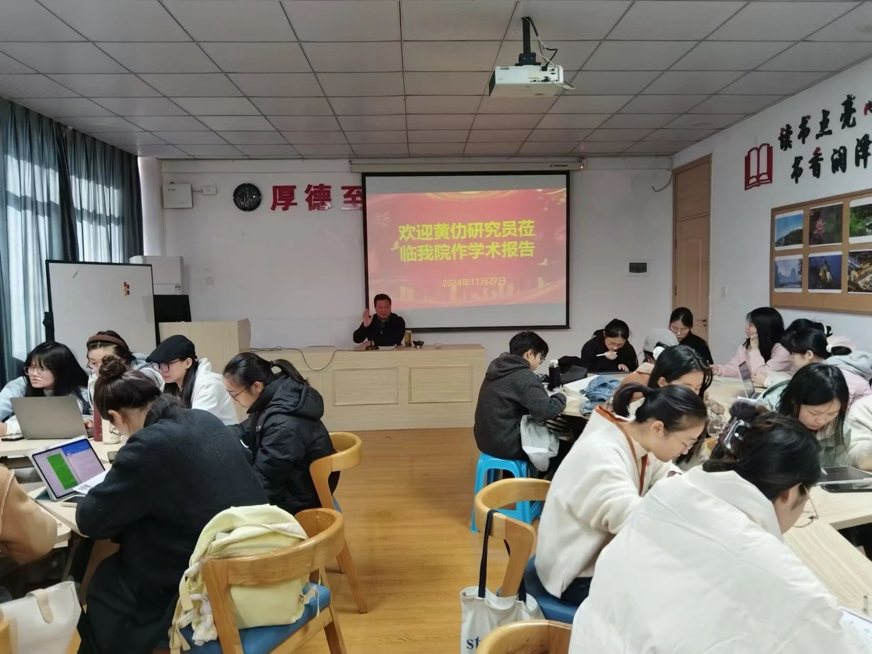 11月27日下午14:10,萍乡学院客座教授,安源路矿工人运动纪念馆原馆长、研究馆员黄仂应邀到我院作了题为“应对‘九月惨案’与投身大革命运动”的专题讲座,本次讲座在跬步楼1409进行,由我院教师王淼华博士主持,我院历史学专业师生60余人参加本次讲座。