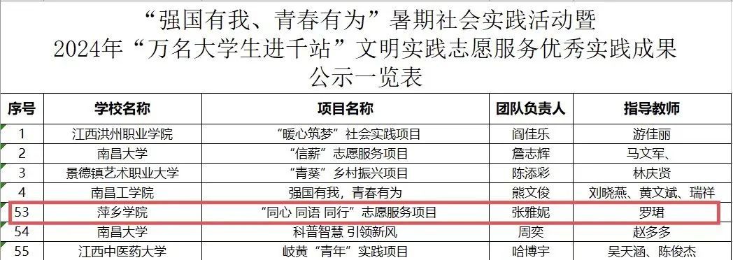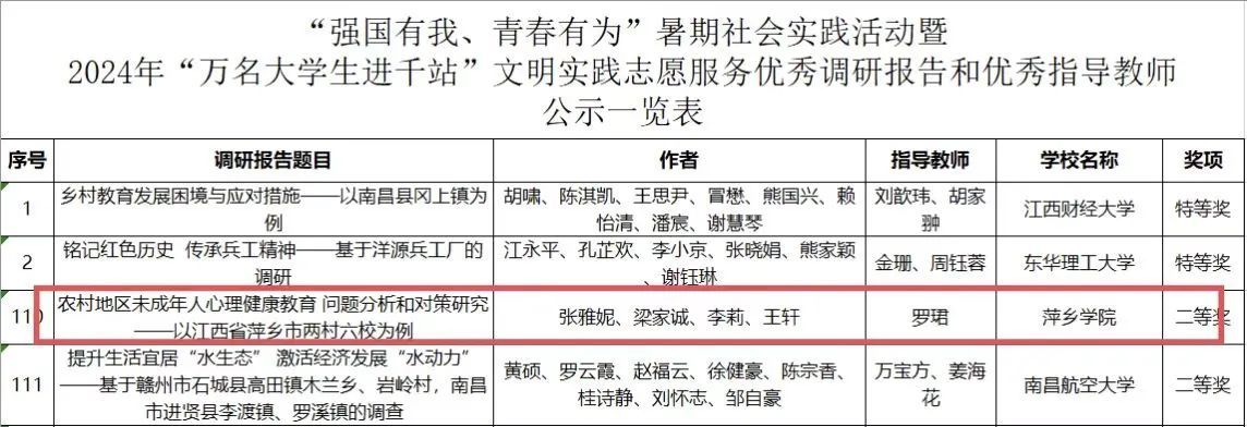 近日,江西省教育厅公布了“强国有我、青春有为”暑期社会实践活动暨2024年“万名大学生进千站”文明实践志愿服务项目评选结果,由党委统战部、人文与传媒学院共同组织的“同心 同语 同行”暑期志愿服务团再获殊荣,志愿服务项目入选优秀实践成果;调研报告《农村地区未成年人心理健康教育问题分析和对策研究——以江西省萍乡市两村六校为例》获评二等奖。