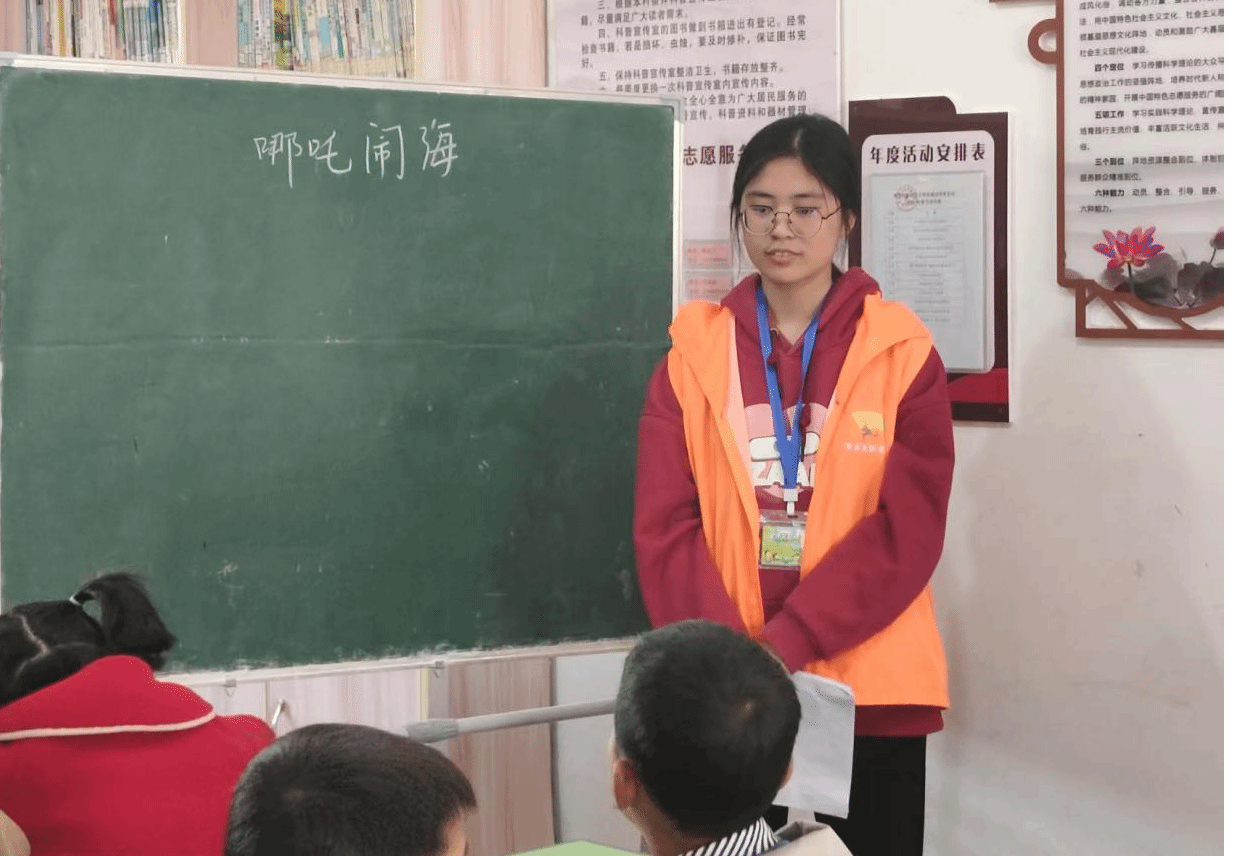 志愿者陈玉莲以经典动画电影《哪吒之魔童闹海》为引,为小朋友们生动地讲述了哪吒的传奇故事。课堂中,陈玉莲通过细腻的语言和丰富的表情,再现了哪吒不畏强权、勇敢抗争的精神,深深地感染了听课的小朋友。她表示希望通过传统文化故事,激发小朋友们对中华优秀文化的热爱与传承。哪吒闹海的故事不仅让大家重温了经典,也传递了勇敢与正义的价值观。