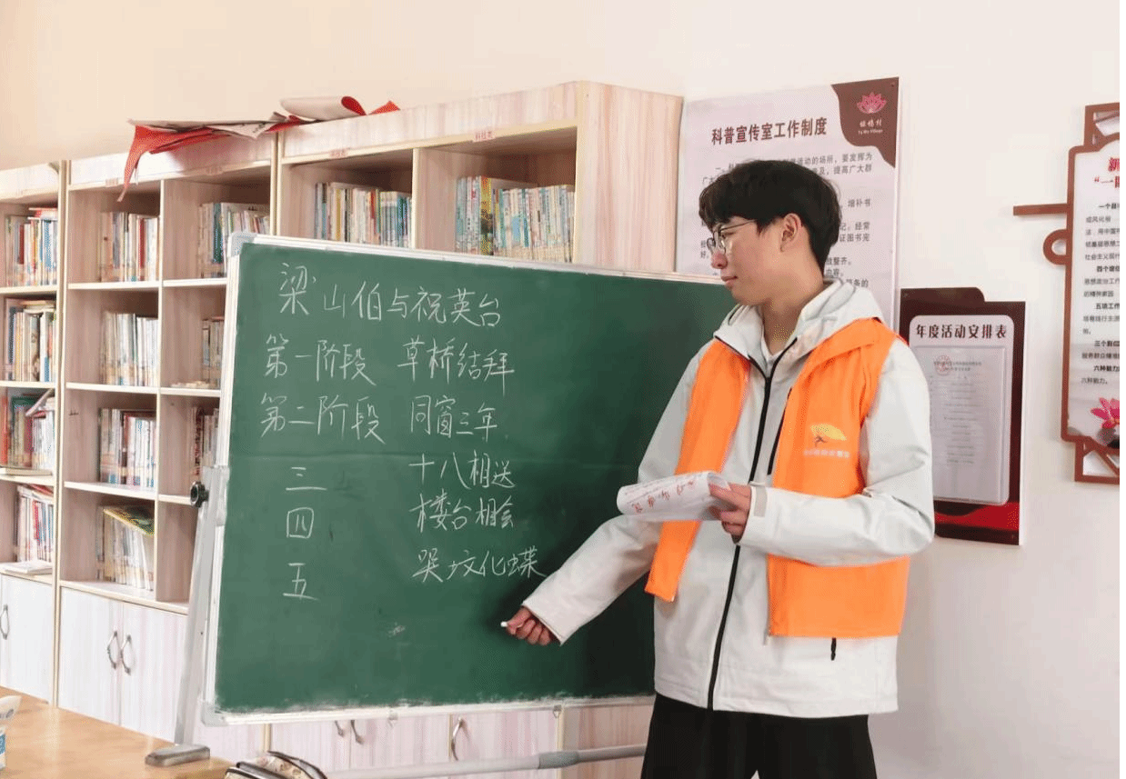 伴随着轻松欢快的小提琴音乐旋律,志愿者张雨枫巧妙地以此引发小朋友们对梁祝故事的联想。授课过程中,张雨枫不仅详细讲解梁祝故事从东晋起源到越剧改编的演变历程,还深入剖析其人物形象,如祝英台的勇敢与局限,梁山伯的君子品格。同时,借助小组讨论 “现代版梁祝中的矛盾” 以及跨文化对比《罗密欧与朱丽叶》,张雨枫让小朋友对这一经典故事的文化内涵、悲剧美学有了更深刻的理解,也启发他们从当代视角重新审视传统故事的价值 。