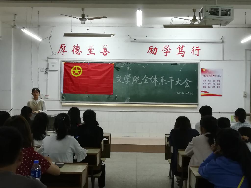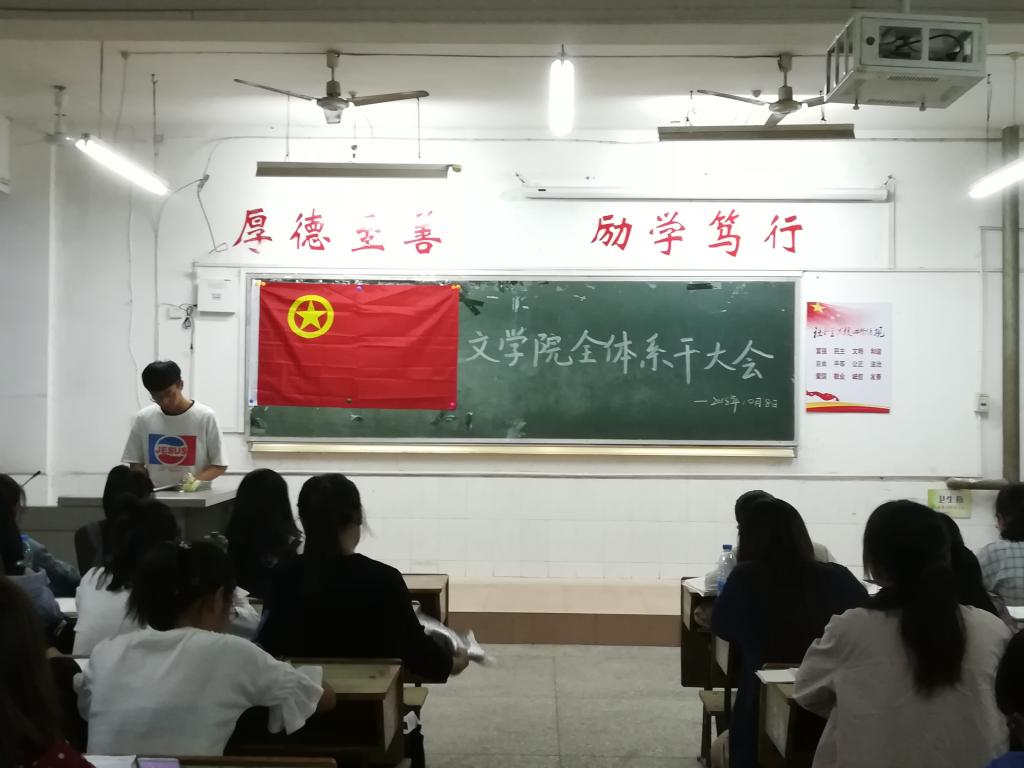 10月8日18:00,文学院在跬步楼1406教室召开全体系干大会。出席本次大会的有文学院院长易志文、文学院团总支学生会主席团及其助理、各部长及其助理和18级各部门实习干事。