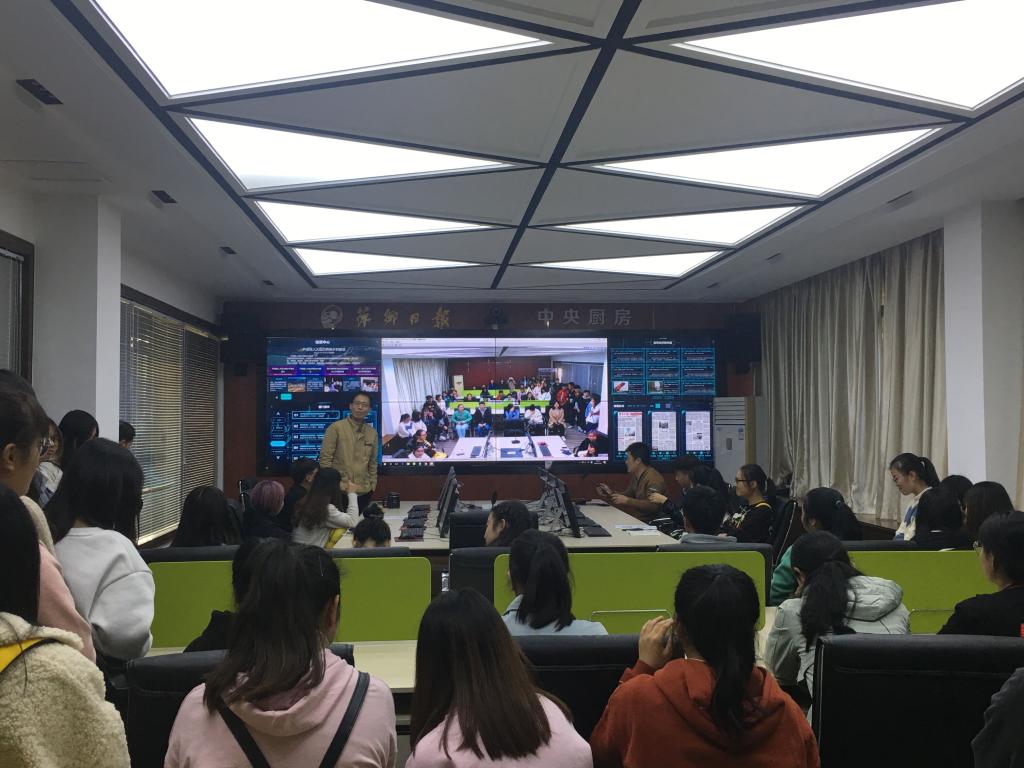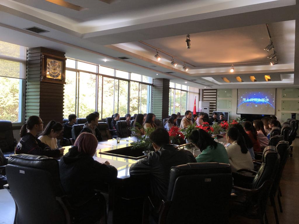 在报社会议室,副总编辑朱良明代表报社致辞欢迎我院师生的到来,并简要介绍了《萍乡日报》的历史和发展概况。报社全媒体编辑中心主任康霞萍、全媒体采访中心主任文怡等前辈就新闻采访、报纸编辑、新媒体等工作流程进行了细致讲解。