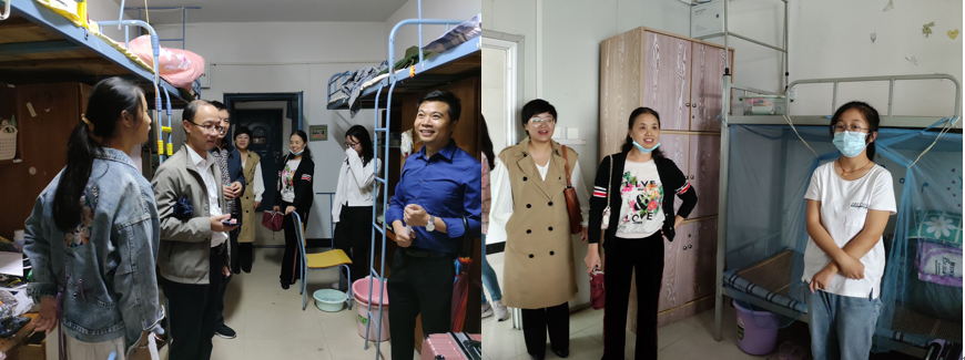 为做好疫情期间新生开学工作,保证新生的健康生活,9月20日下午16:00 ,人文与传媒学院党总支书记吴芳、党总支副书记孙琦和团总支书记黄如光及班主任龚正良、黎农前往学生宿舍9栋探望20级新生。