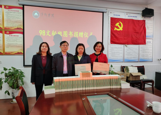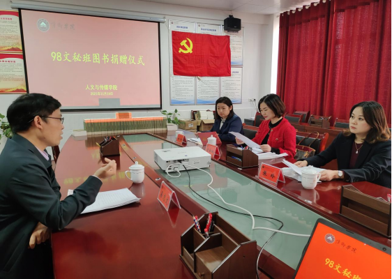 11月19日下午,我院在跬步楼1404会议室举行了98文秘班图书捐赠仪式。院长易志文出席本次捐赠仪式,校友杨倞、曾红桃、张玲参加会议。