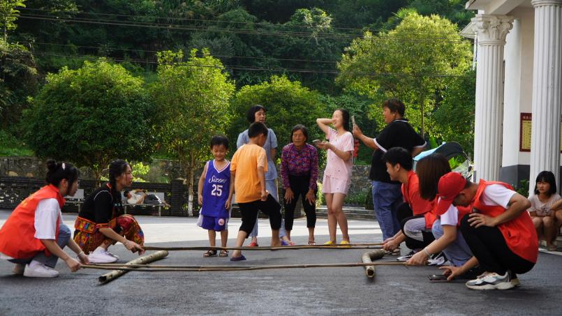 在两根普普通通的竹竿上,大家数着“开合、开合、开合.....”的节奏跳来跳去,在灿烂的阳光下肆意欢笑,老人孩童和“红马甲”成为这“红色、绿色、古色”棋盘山中最绚丽的一道风景。原本沉寂的村子变得热闹起来,从零星的几个人参与到全村的积极互动,志愿者们以自己的青春朝气点燃了村民的活力与激情。