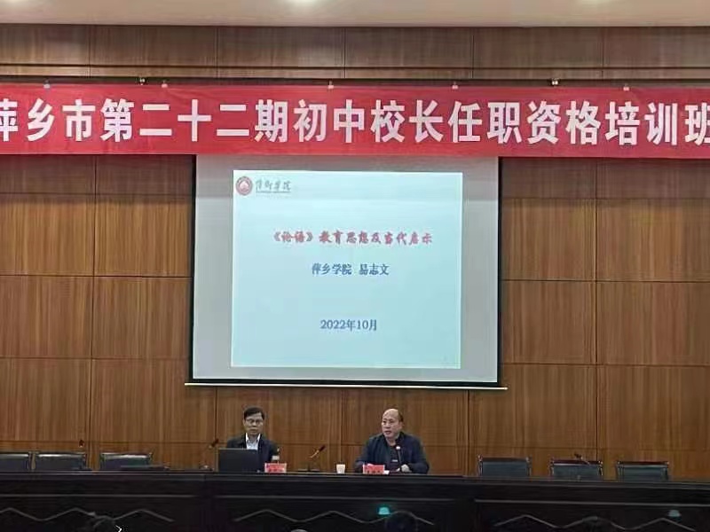 聚精会神学技艺,踔厉奋发写新时代。为推动初中教育高质量发展,近日,萍乡市教育局主办了萍乡市第二十二期初中校长任职资格培训班,我院院长易志文教授在此次培训班上开展了《<论语>教育思想及当代启示》的专题讲座。