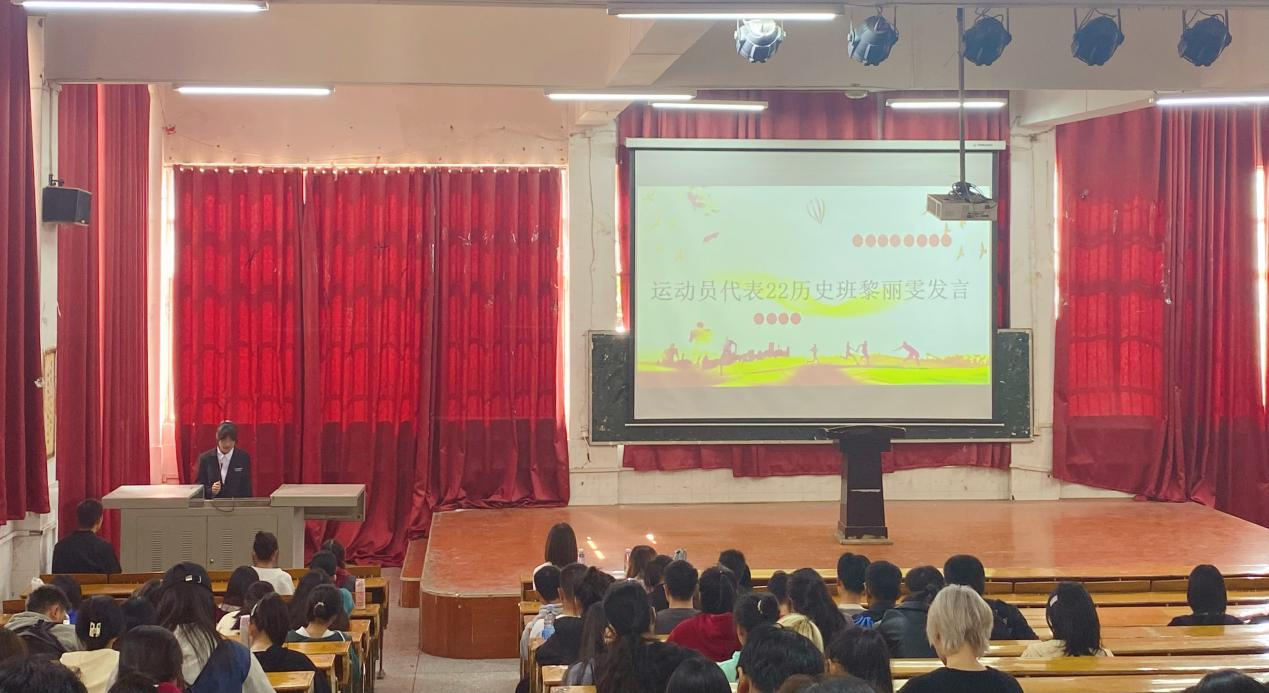 随后,运动员代表22历史班黎丽雯发言。她指出了运动的意义,她认为运动是青春能量的爆发,并希望所有运动员能赛出成绩,赛出风采,赛出自我。最后,黎丽雯带领全体运动员宣誓,“赛出风格,赛出水平”。声音响彻整个教室,誓言充满力量,会上掌声如雷。