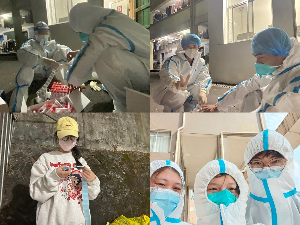 我院学生志愿者接到任务后立即开始核酸检测工作。他们与医护人员分工明确,安排有序,推动了核酸检测工作的高效运行。由于九栋人员数量多,学生志愿者们穿着防护服连续高强度工作七小时,无暇吃饭,但始终保持着工作热情,专心投入工作。