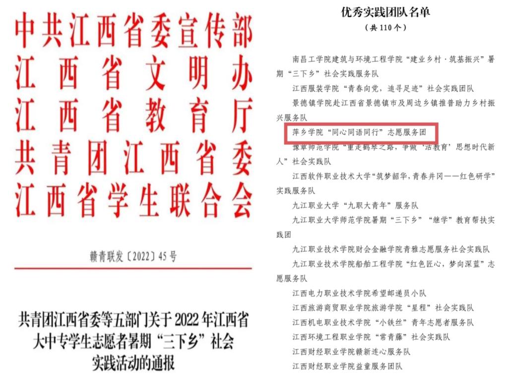 近日,共青团江西省委等五部门联合发布《关于2022年江西省大中专学生志愿者暑期“三下乡”社会实践活动的通报》,我院“同心 同语 同行”志愿服务团荣获江西省大中专学生志愿者暑期“三下乡”社会实践活动优秀实践团队。
