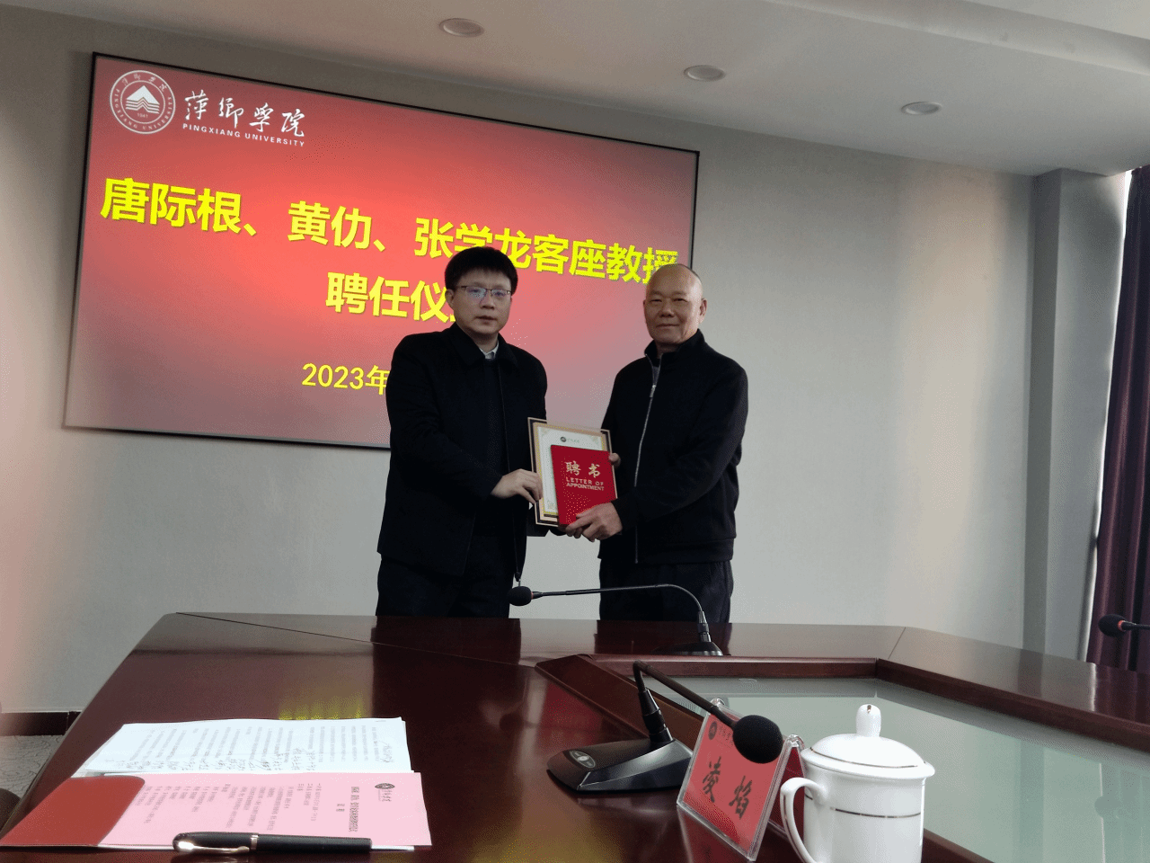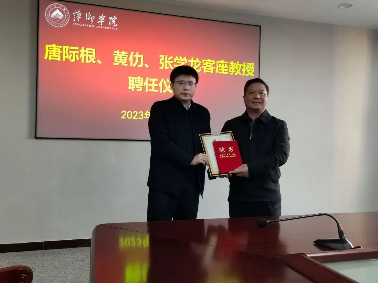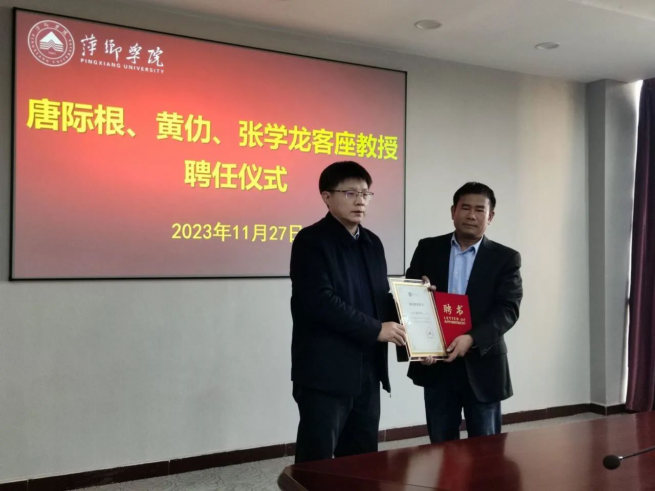 授聘仪式之初,由人文与传媒学院院长郭慧介绍唐际根、黄仂、张学龙三位客座教授情况。唐际根,现为南方科技大学讲席教授,中组部、人社部百千万人才国家级人选,主要研究方向为青铜时代考古。曾长期主持殷墟发掘,率队发现并发掘洹北商城遗址,并促成殷墟成功列入世界文化遗产名录。主持过国家社科基金重大项目、重点项目,以及省部级项目多项。黄仂,历任江西省萍乡市文化广电新闻出版局副局长,安源路矿工人运动纪念馆馆长,书记,江西省萍乡市红色文化研究中心副主任,秘书长,现江西省文化艺术学科带头人。张学龙,市政协提案委主任,中国作家协会会员、江西省作家协会理事、江西省滕王阁文学院特聘作家,市作家协会名誉主席,其作品曾入围茅盾文学奖。