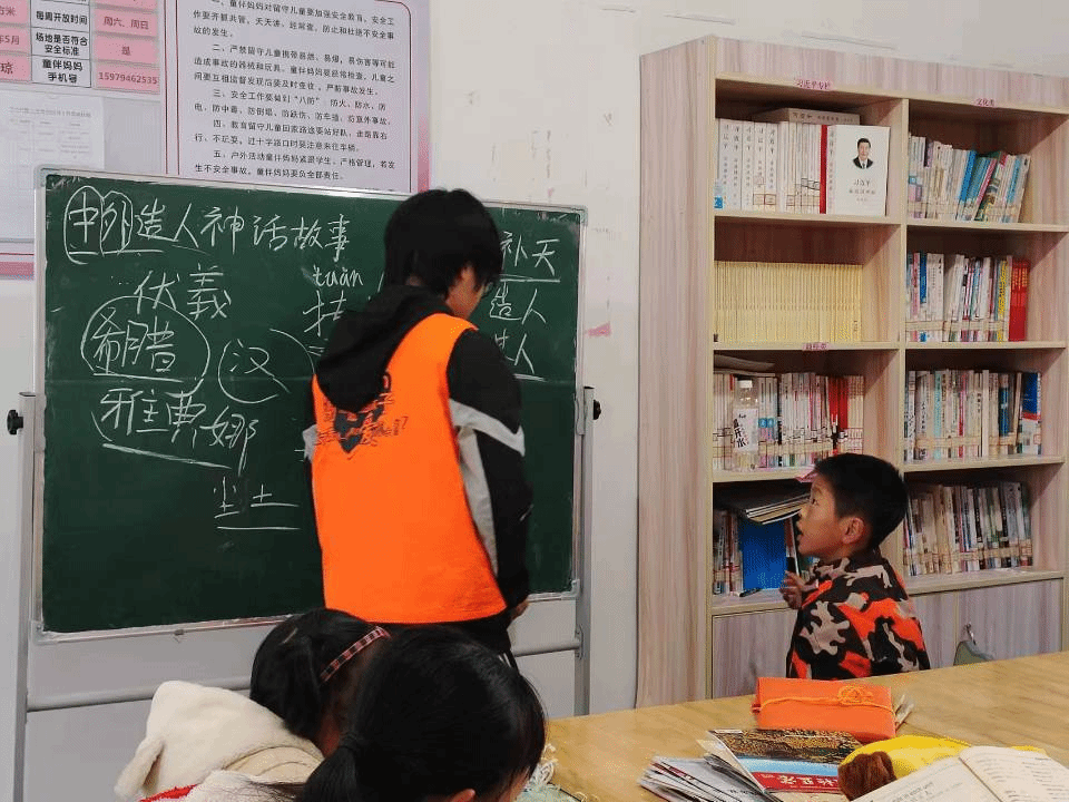 “中外神话真奇妙”。邱俊凯给小朋友介绍不同的神话故事:女娲造人、普罗米修斯造人、上帝耶和华造人。义教队队员生动形象的讲解帮助小朋友充分发挥联想力与想象力。
