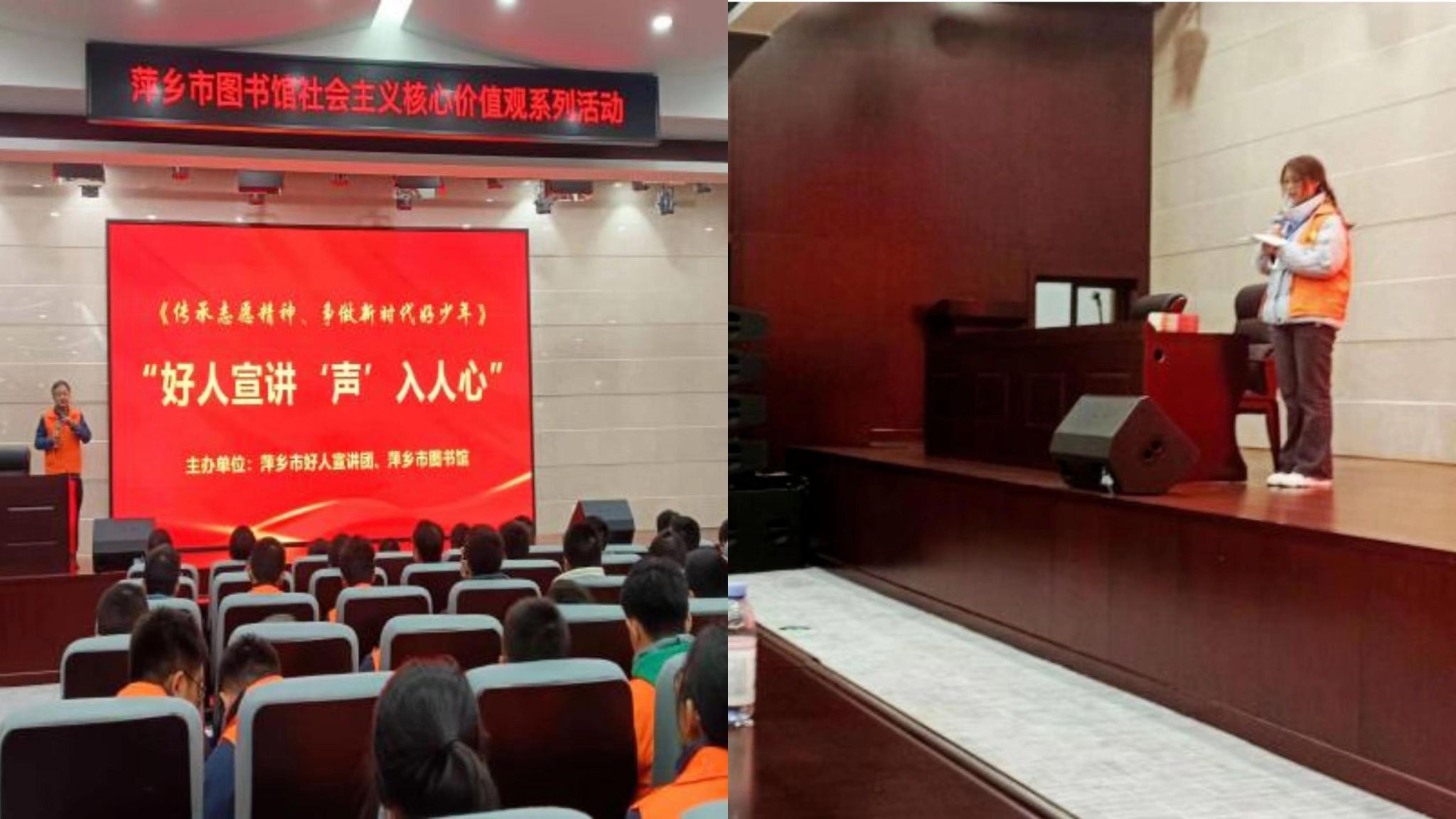 接下来,义教队队员们还携孩子们一同参加好人宣讲活动。由萍乡市好人宣讲团和萍乡市图书馆主办的“好人宣讲,‘声’入人心”活动激励孩子们学习善良、正直等优秀品质,从而促进他们树立正确的人生观和价值观。在宣讲会中,我院义教队队员甘颖同学发表讲话,她将活动中的所见所闻所感娓娓道来,并感谢孩子们的出现让我们有了一个表达爱的机会。