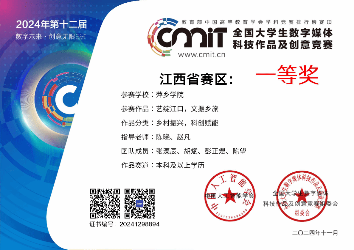 近日,由中国人工智能学会主办、成都工业大学承办,央视网和北京翼扬科技发展中心大力支持的“2024全国大学生数字媒体科技作品及创意竞赛”全国现场总决赛,在成都工业大学圆满落幕。我院学子以省赛第一的成绩成功入围全国总决赛,并在全国总决赛中荣获二等奖。